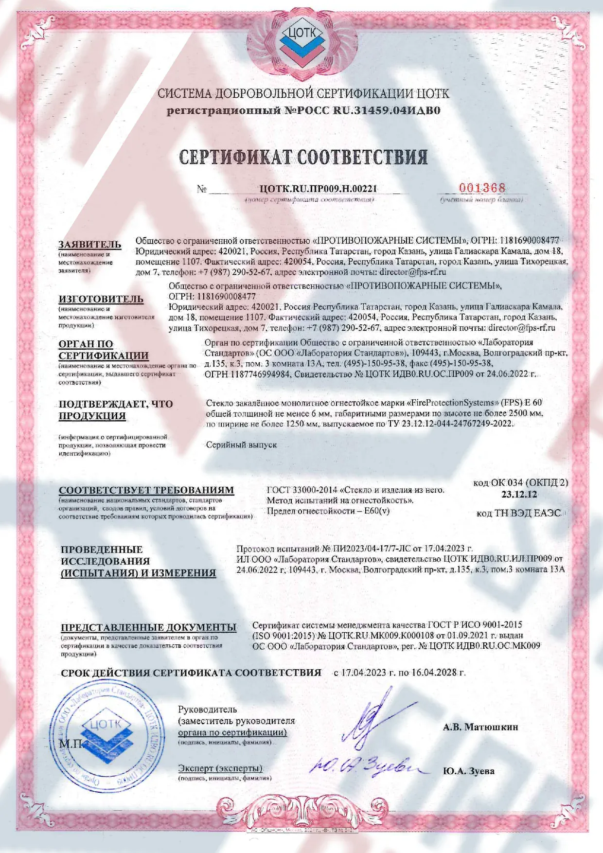 Сертификация по международным стандартам – соответствует ГОСТ Р 53308-2009, EN 1364-1, подходит для объектов любого назначения.